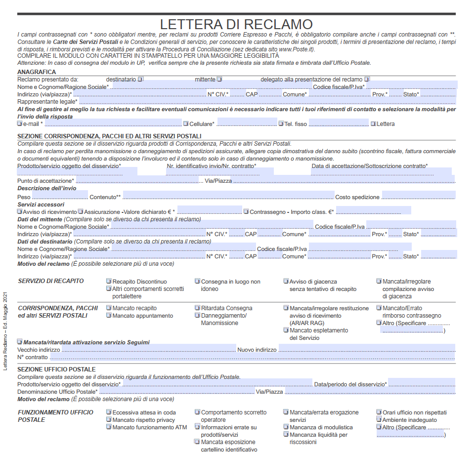 Di seguito è possibile scaricare il modello reclamo Poste Italiane per pacchi PDF.